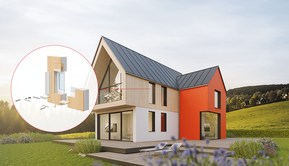 Implio P ist das individualisierbare Fenster- und Türanschluss-System aus Holzfaser für Putz- und hinterlüftete Fassaden. Es umfasst Laibungs- und Keilplatten, die ebenso maßgefertigt werden wie optional verfügbare Rollladen- und Raffstorekästen. Durch die hohe Vorkonfektionierung aller für den Fensteranschluss benötigten Elemente gelingt die dauerhaft wind- und schlagregendichte Abdichtung zügig und zuverlässig – zumal mit nur einem beteiligten Gewerk. Hinzu kommen zwei unabhängige Abdichtungsstufen sowie ein robuster Putzanschluss an der Keilplatte, welche die Sicherheit gegen feuchtebedingte Bauschäden auf das Maximum erhöhen.
